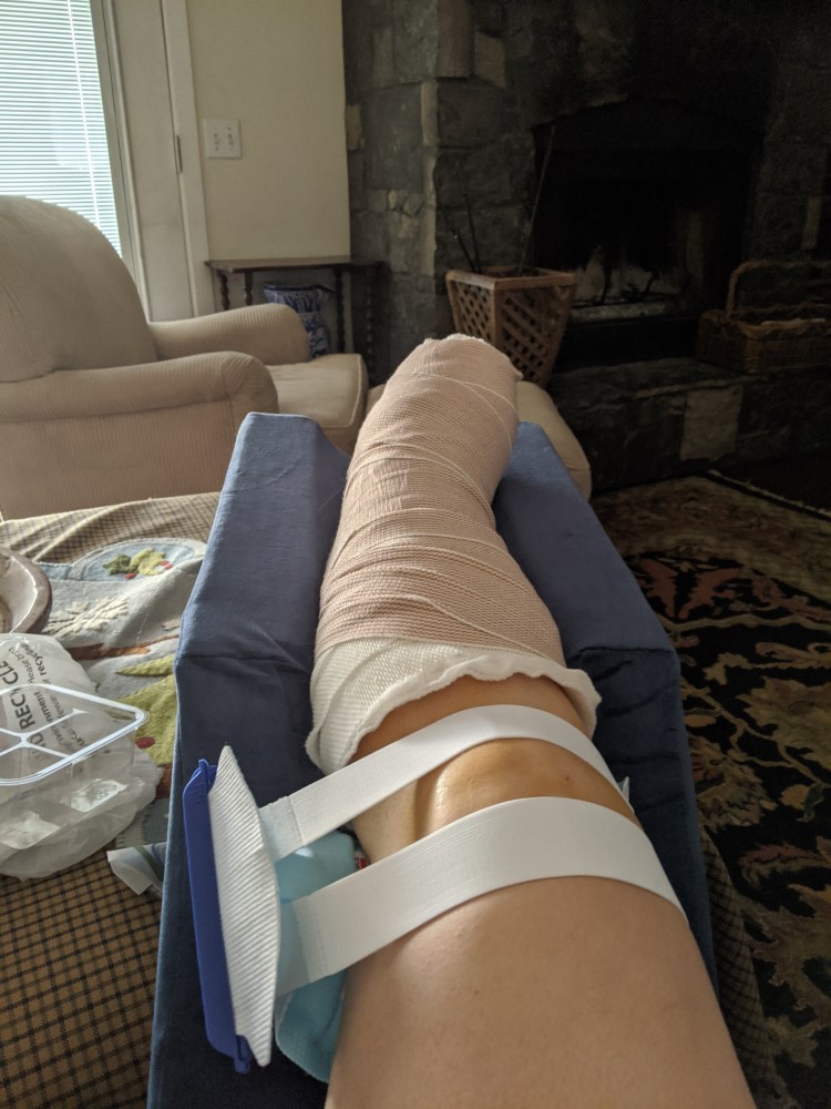 Prepare proper attire for your surgery day and time after. You need to be able to go home in pants that can fit over a thick wrap on your leg so shorts, skirts or wide stretchy pants are ideal. I accidentally wore fitted yoga pants day of, after my surgery they said they would have to cut them get them on me or I had no pants to go home in. Luckily I had someone drop off some shorts for me instead (I lived close by the hospital and really liked those yoga pants). Once you get a removable boot with a smaller wrap under, you can put pants in boot, but keep in mind your knee will be pushed in your scooter often so rough fabric can cause imprints/irritation to the knee (way more of an issue than I predicted, it hurts). I would suggest comfy shorts when this is an issue and super soft fabrics.