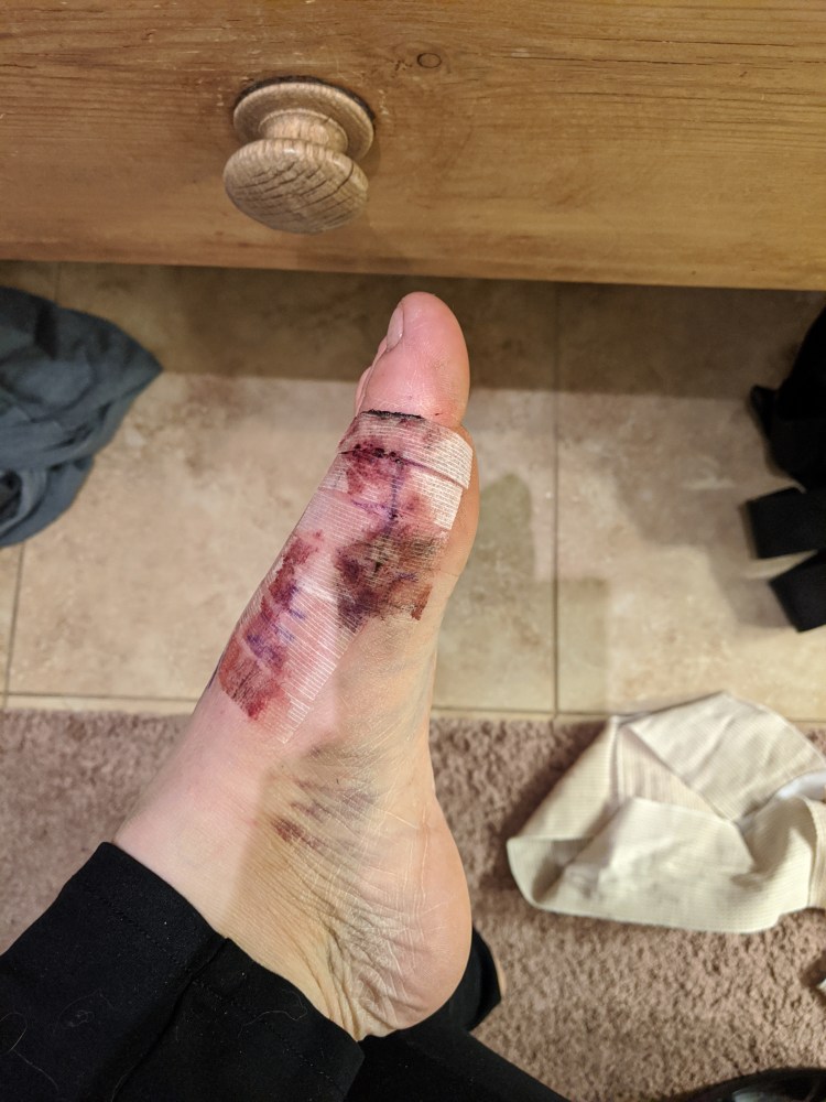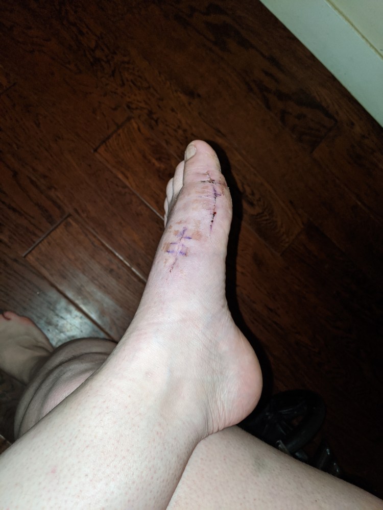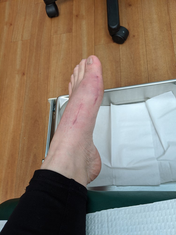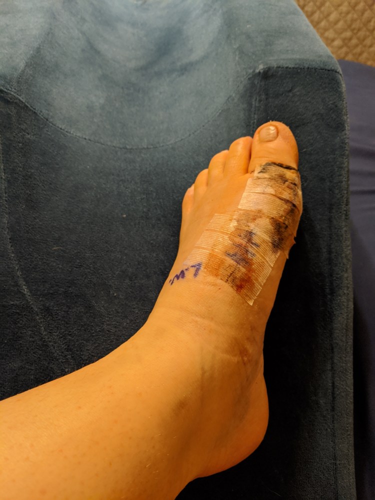 Brusing, dried blood and tape over stitches. Allowed to start getting foot wet.
