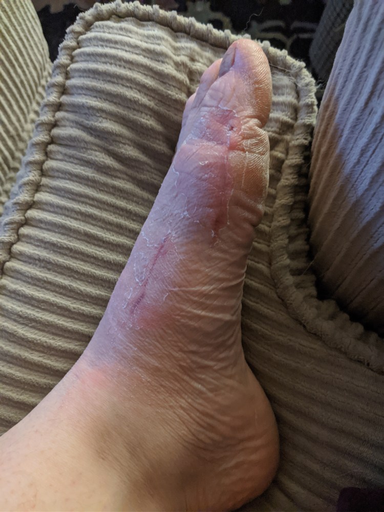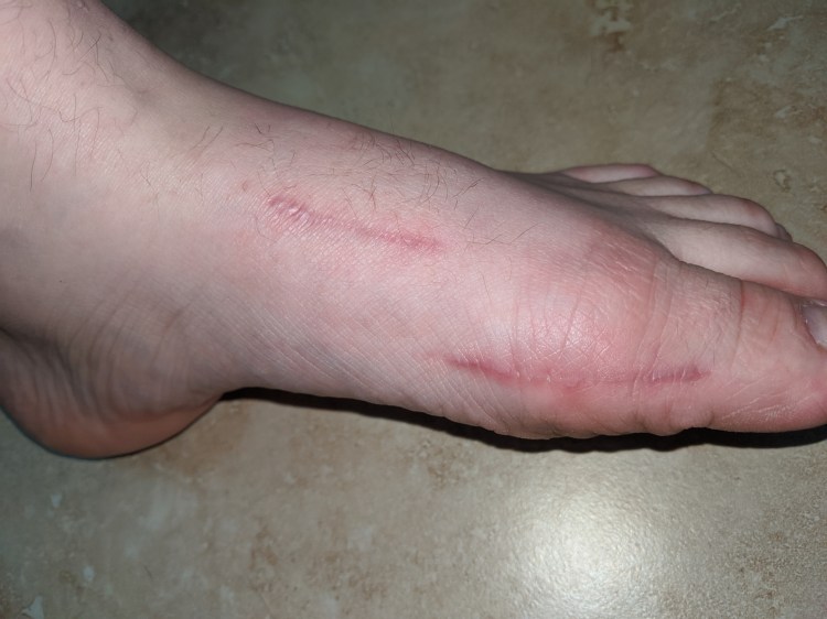 36 days after surgery. All scabbing, dry blood gone. Left with peely foot and lots of dry skin